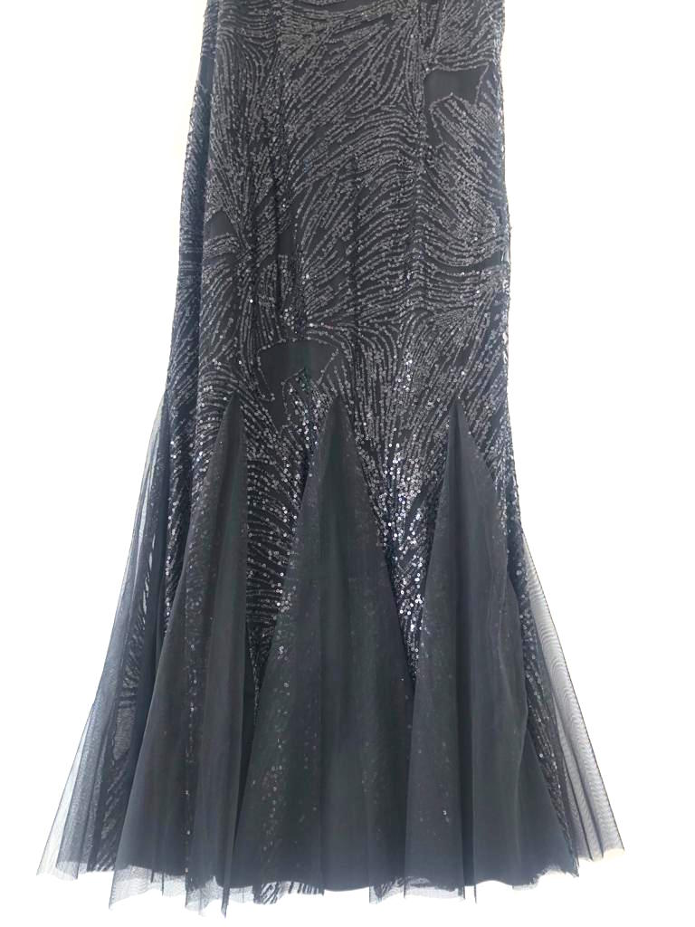 Vestido largo negro de lentejuelas, corte sirena con gasa en la parte posterior.
